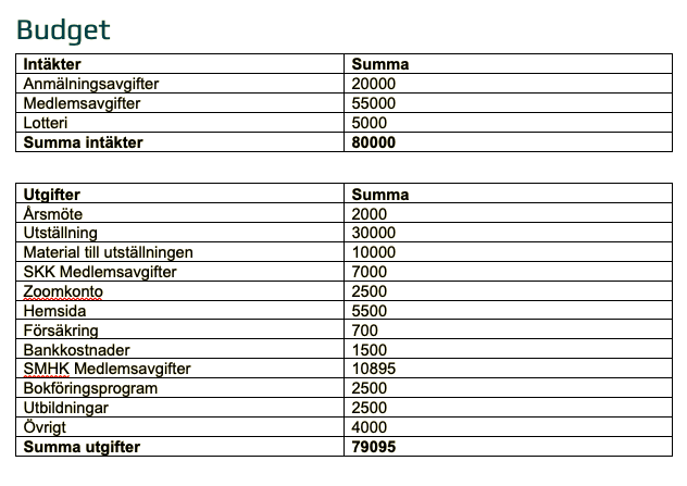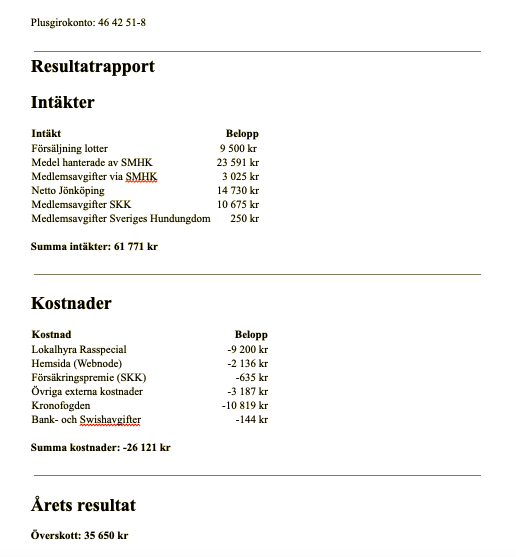 Ordföranden har ansvarat för kontakter med Skatteverket och banken i syfte att säkerställa klubbens tillgång till bankkontot, samt för betalning av fakturor. Vid tillträdet uppmärksammades att vissa fakturor från tidigare styrelseperioder, avseende verksamhetsåren 2023 och 2024, inte hade reglerats och inte heller varit kända för den nuvarande styrelsen. I några fall hade ärendena överlämnats till Kronofogdemyndigheten för indrivning, vilket ledde till att utmätning skedde under 2025. Föreningens ekonomi under verksamhetsåret 2025 har varit stabil med ett positivt resultat. Året inleddes med ett ingående saldo om 21 593,88 kronor och avslutades med ett utgående saldo på 57 244,03 kronor. Under året uppgick de totala intäkterna till 61 771,00 kronor. Intäkterna har huvudsakligen bestått av medlemsavgifter samt ersättningar och medel kopplade till aktiviteter och arrangemang, däribland hanterade medel via SMHK samt nettointäkter från utställningshelgen i Jönköping.